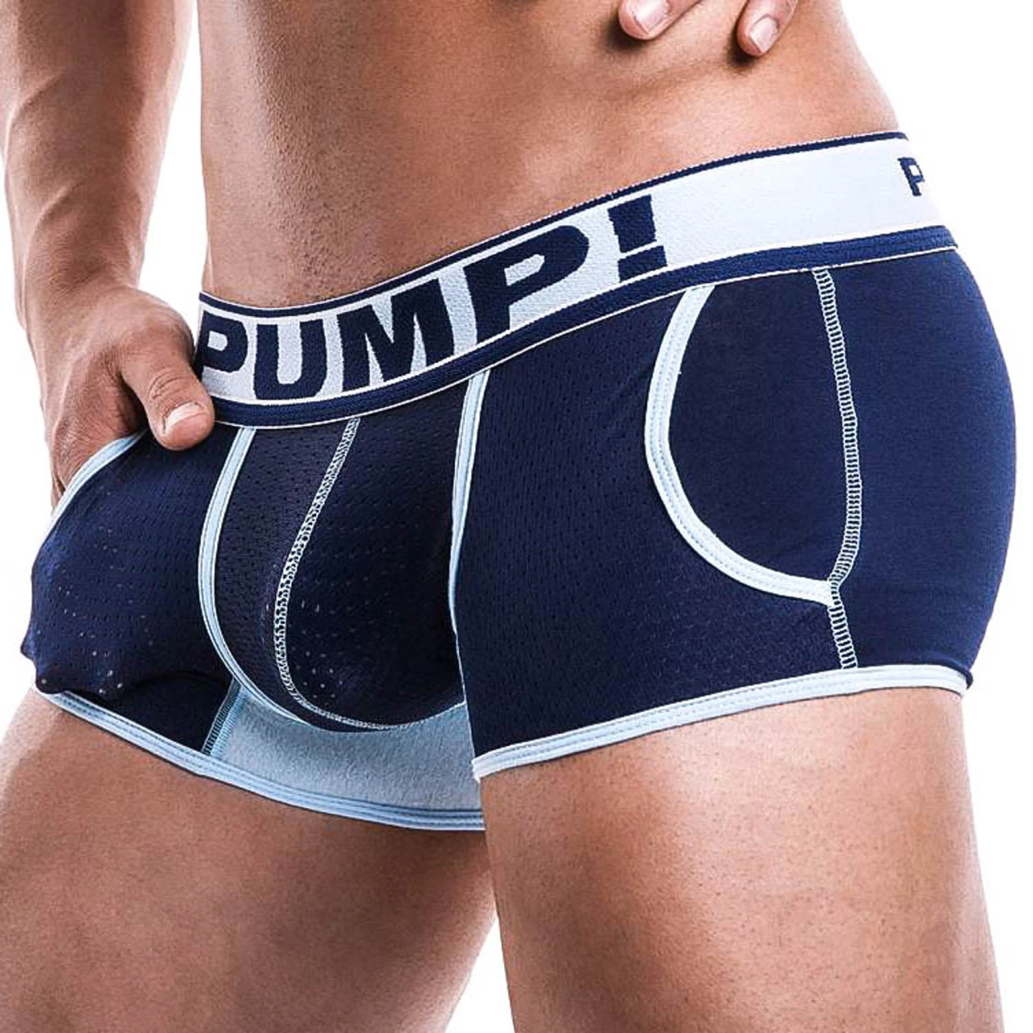 Blue and navy cotton boxer with navy mesh pockets.